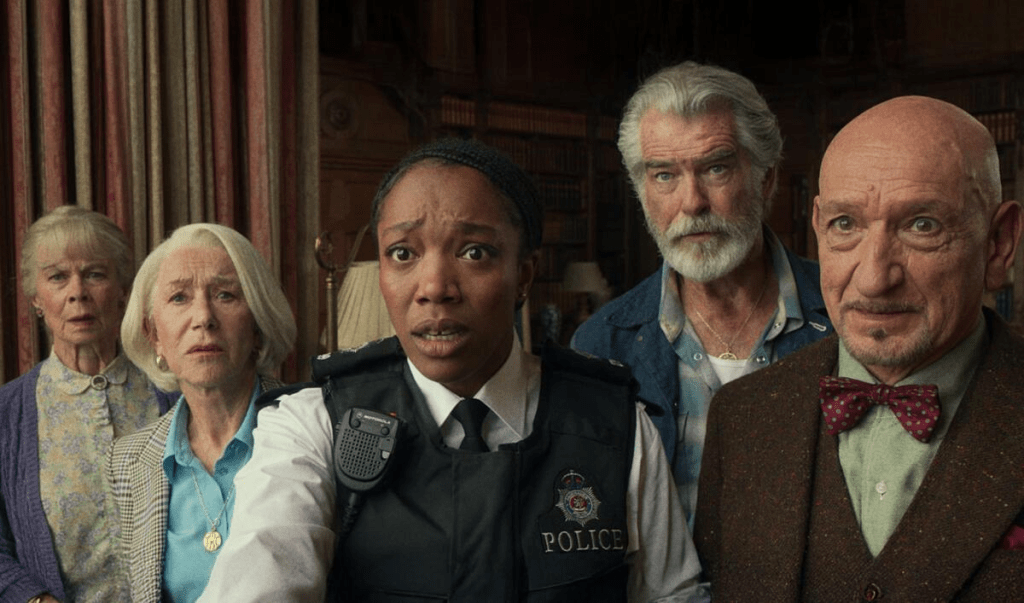 Maybe the stellar cast can save it? Difficult considering the material they are working with. Helen Mirren as Elizabeth, the leader of the Thursday Murder Club, answers the question, Where did DCI Jane Tennison from Prime Suspect go?. She is the primary focus of the film, and she does well to keep an air of dignity. Pierce Brosnan as Ron, a former trade union leader, is fine. At the same time, Ben Kingsley is poorly underused and Celia Imrie creates a perfectly likeable character as Joyce, the newcomer to the home and the team. David Tennant plays against type as a nasty land developer, but seems miscast; however, Daniel Mays, as the officer leading the case, steals the film from everyone with a tongue-in-cheek performance.
