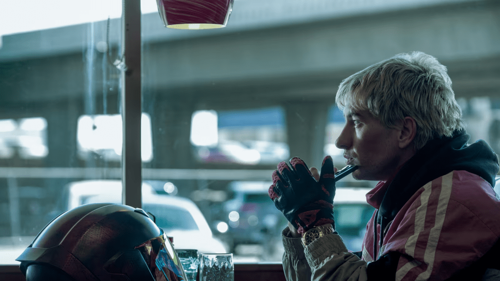 If you think the film is going down one route, then Layton throws in the human time bomb in the form of Ormon, a bleach-blonde biker who is a brutal kid who is hired to follow Davis to see what his next move will be. It also has a brilliantly executed scene in which a cop and a thief share a car, both hiding behind the characters they play, yet having a conversation that nods to the film’s influences. It is a well-written sequence that works the same way the cafe scene in Heat works.