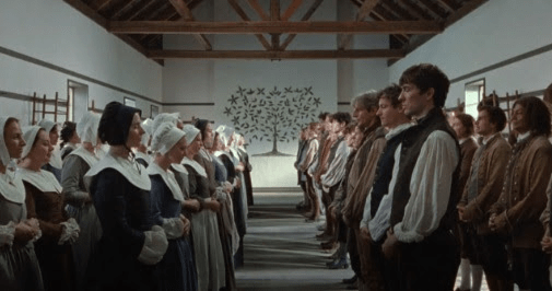 Fastvold and co-writer Brady Corbet have taken the story’s basis, which would have been fascinating on its own, and given the film a shake-up, just as the religious group throws itself into its beliefs. Capturing the period with perfect costuming, setting, and matte designs (where the scenery is painted rather than created by CGI), the film has the feel and a great sense of the time. Yet instead of just telling the tale through dramatic incidents, the inclusion of song and dance takes it to another level.