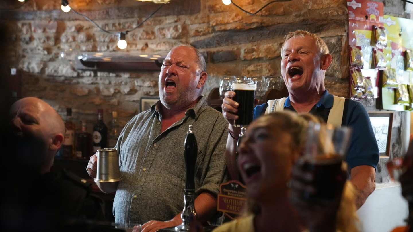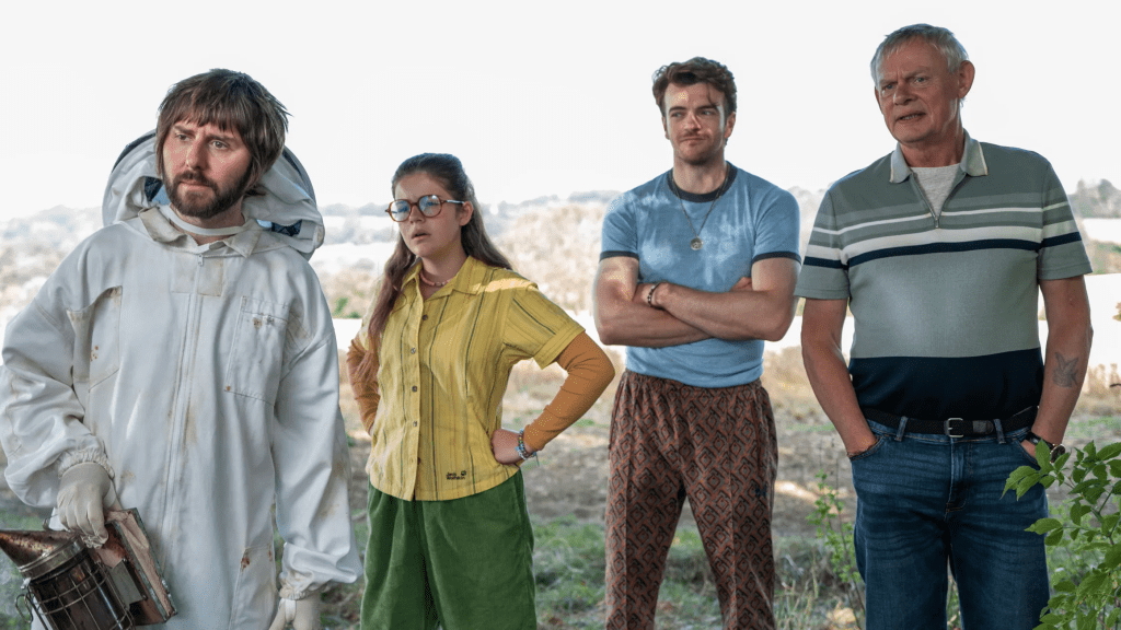 The cast all seem to be having a great time, with The Inbetweeners James Buckley taking creation of Jay to the next level, this time as Jake, the sarcastic son and brother.Jonno Davies, who played the monekty version of Robbie Williams in Better Man, is perfectly bland as Cal, while Martin Clunes, who stole the show in Wuthering Heights, gets to play grumpy as Mick and Mark Addy, from The Full Monty, delivers another droll performance as local quirk, Paxman.